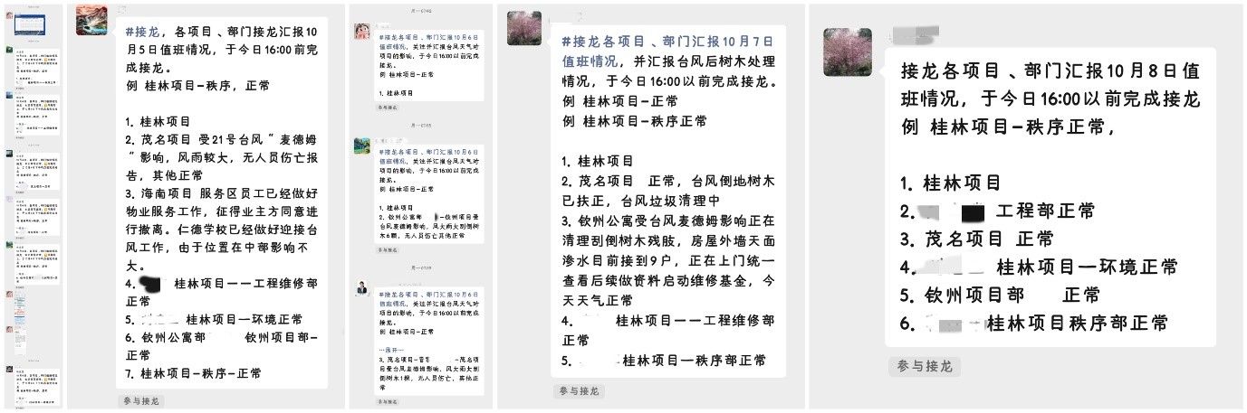 纪律严明,信息畅通无阻——值班值守与总部查岗机制有效运行;为确保假期各项工作有序开展,信息沟通顺畅,各项目严格执行“一天一汇报”制度。每日,各岗位值班人员通过工作群进行接龙汇报,简要说明突发事件及处理情况等。与此同时,总部不定期对各项目值班岗位进行电话查岗,检查人员在岗情况及应急响应能力。分公司各项目值班人员均能及时接听电话,清晰告知岗位情况和园区平安状态。这一严谨的值班管理体系,确保了节日期间指挥不断线、响应不延迟、服务不缺位。