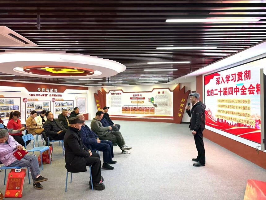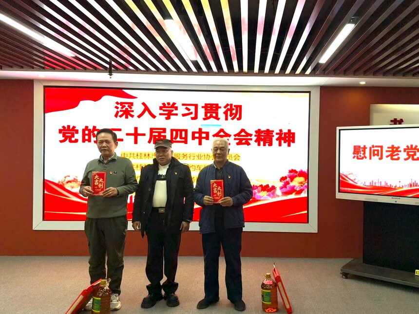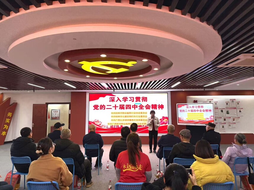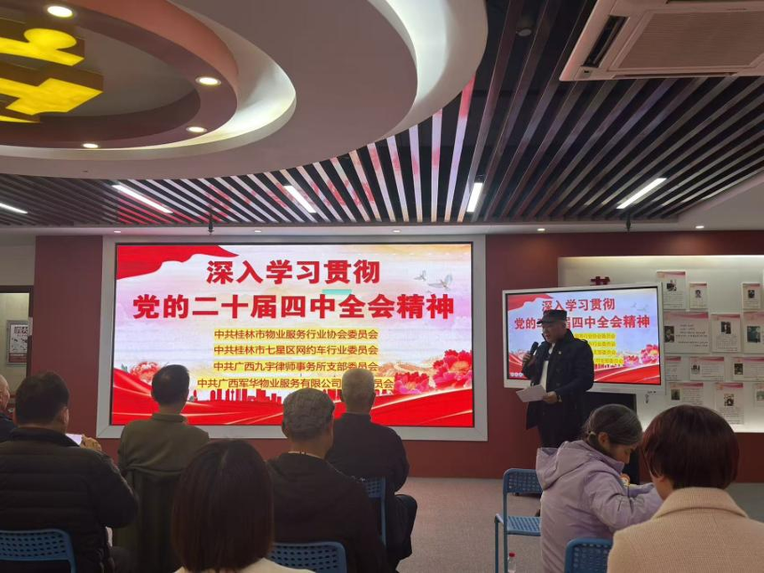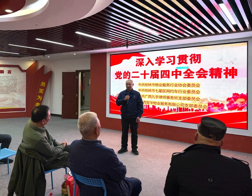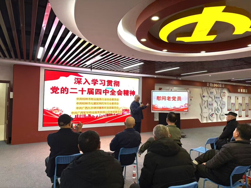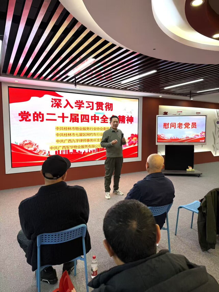 军华物业 ||【主题党日活动】联学共建映初心,薪火相传聚合力——广西军华物业服务有限公司党支部联合多家党组织开展主题党日活动联学共建映初心 薪火相传聚合力------- 广西军华物业服务有限公司党支部联合多家党组织开展主题党日活动 为深入学习贯彻党的二十届四中全会精神,加强党员思想政治教育,切实把全体党员的思想和行动统一到党中央决策部署上来,不断强化基层党组织政治功能和组织功能,凝聚推动高质量发展的强大合力,激励广大党员不忘初心、牢记使命,推动党建工作与行业服务深度融合,2026年1月16日下午,广西军华物业服务有限公司党支部在创意产业园创意大厦党群服务中心举行了一场主题鲜明、内容丰富的主题党日活动。活动特邀桂林市物业服务行业协会党委、桂林市七星区网约车行业党委、广西九宇律师事务所党支部等党组织领导及党龄满50年的老党员代表出席。支部全体党员、入党积极分子及申请人参加活动。活动以"联学共建、传承关怀、铭记初心"为主线,通过专题学习、现场慰问与集体政治生日等形式,实现了跨行业党组织的深度交流与共同提升。