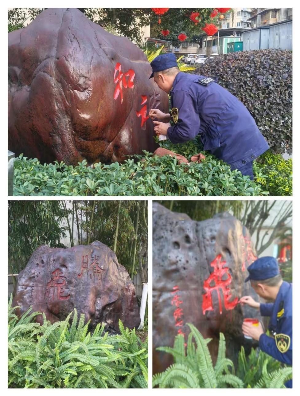 节日装饰亮眼,营造浓浓年味;工程部师傅们联合秩序部,在园区大门悬挂起大红灯笼,在主干道两侧缠绕彩色灯条、红灯笼,在单元门厅贴上喜庆的春联和福字。值得一提的是,秩序值岗人员还特别对园区内的景观石进行了“上油”保养,使其表面更加光亮润泽,在阳光下熠熠生辉。夜幕降临,华灯初上,整个园区流光溢彩,处处洋溢着节日的喜庆氛围。