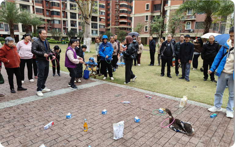 本次活动现场,套圈圈当之无愧成为全场人气焦点。项目精心准备了各式各样的实用奖品,其中鸭子凭借十足的年味与接地气,成为全场最受追捧的“人气大奖”。为赢取这份心意好礼,活动现场排起了长龙,业主们个个摩拳擦掌、跃跃欲试。现场欢呼声、喝彩声此起彼伏,一只只鸭子陆续被成功套中、名花有主,大家收获满满,脸上洋溢着开心的笑容。“这样的活动太有意义了,不仅让我们重温了传统节日的习俗,还认识了不少邻居,感觉小区就像一个大家庭一样温暖。你看,我还套中了一只鸭子,希望今年也像今天一样好运连连、福气满满。”参与活动的业主王女士开心地说道。